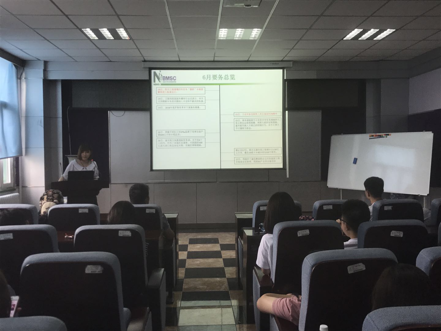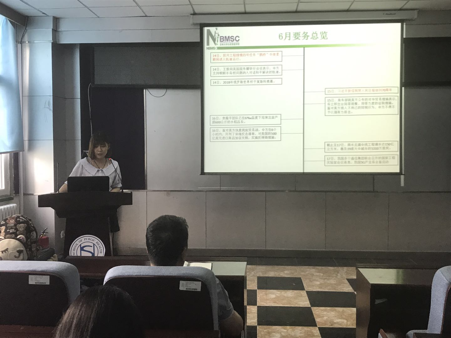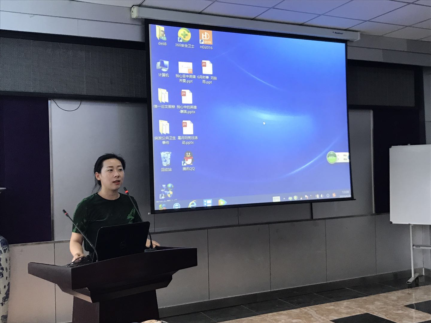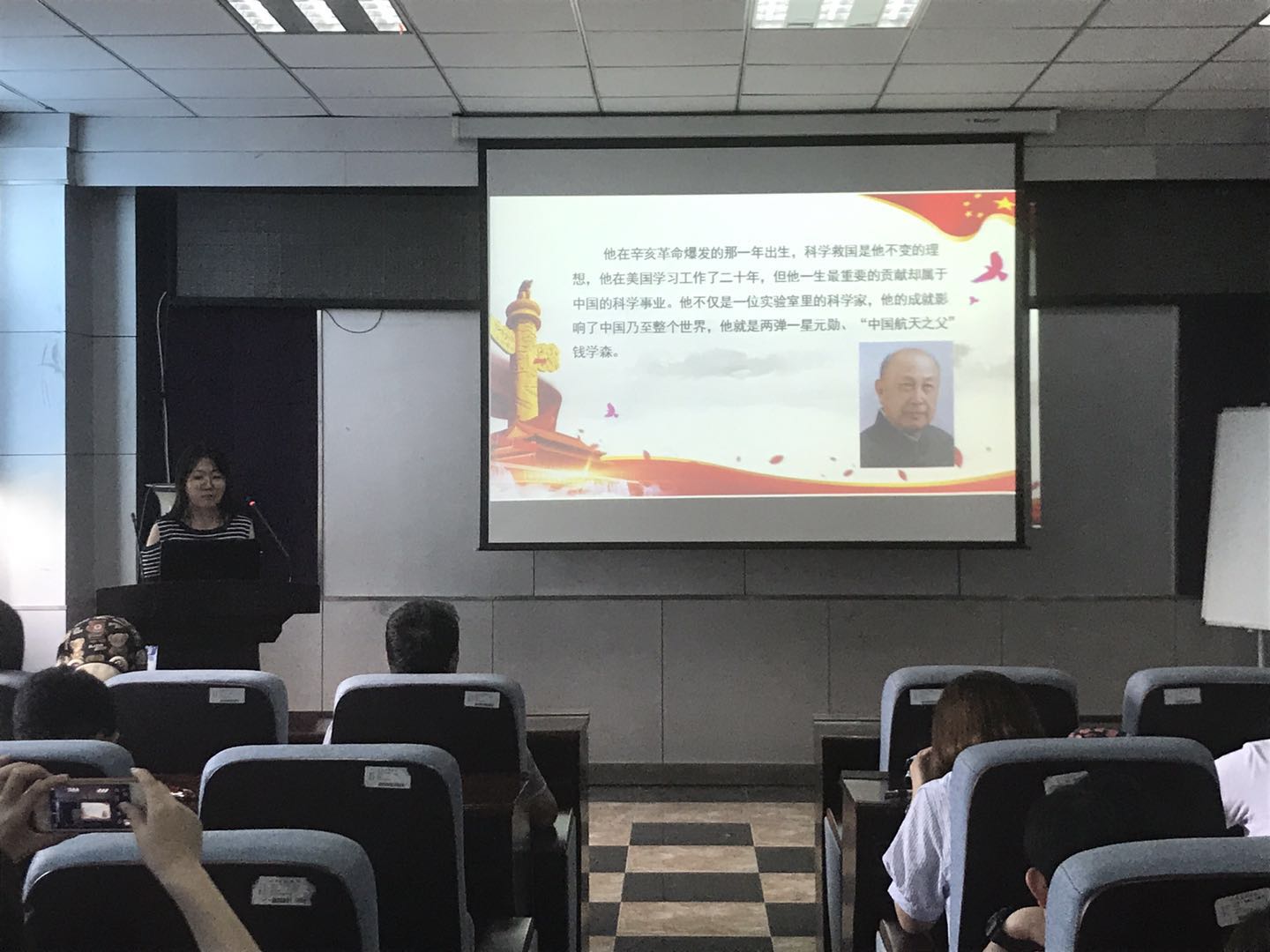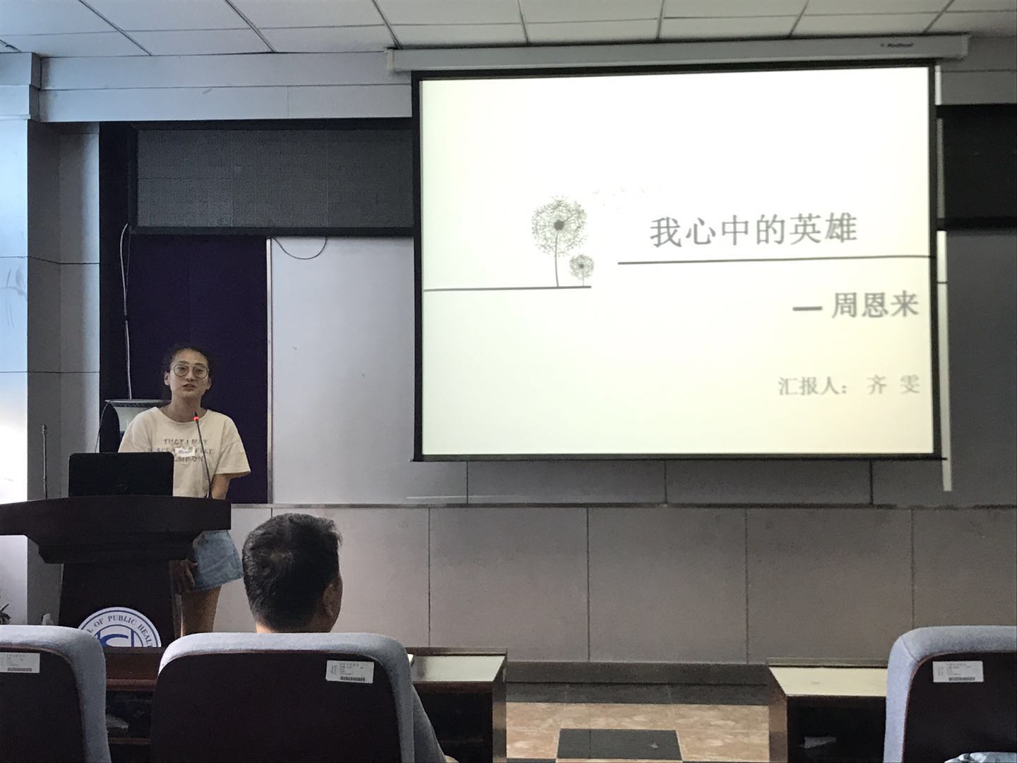 每个人的心中都有一个英雄,这个英雄是我们的榜样,值得我们去学习他身上的高尚品质。齐雯同学说她心中的英雄是周恩来,希望同学们可以学习他勤勤恳恳,任劳任怨,鞠躬尽瘁,死而后已的全心全意为人民服务的精神;严于律己,无私无我的奉献精神;在科研道路上求真务实,脚踏实地。紧接着,康琪同学讲述了狼牙山五壮士的故事,马宝玉、胡德林、宋学义、葛振林和胡福才五位英雄为掩护群众和部队撤退,毅然地把敌人引上了狼牙山棋盘陀峰顶绝路,为了不让敌人发现自己的部队,跳崖身亡,用生命和鲜血谱写出了一首气吞山河的壮丽诗篇,希望同学们以这种精神为动力,勤奋学习,刻苦钻研。随后,扈月阳同学谈到邓稼先是自己心中的英雄,为了祖国的强盛,为了国防科研事业的发展,他甘当无名英雄,默默无闻地奋斗了数十年。他常常在关键时刻,不顾个人安危,出现在最危险的岗位上,充分体现了他崇高无私的奉献精神。最后,刘丝雨同学总结了6月份的时事新闻,让同学们更多地了解国内外发生的事件,更加客观地认识新闻事件。