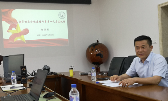 最后,学院党委赵国利书记以“让党旗在防控疫情斗争第一线高高飘扬”为主题为大家讲了一堂党课,他从疫情期间国际国内形势,从疫情中我们看到什么,以及发挥党员先锋模范作用有序推进复学复课三个方面进行了讲述,赵书记分享了广大学院校友参与防控疫情一线的抗疫故事,指出了我们国家之所以在短时间内取得了疫情防控的决定性成果,充分体现了我们党的坚强领导和我国社会主义制度的优越性、充分体现人民群众的磅礴力量、体现了冲锋在前的共产党员的责任担当。在常态化疫情防控下,大家应充分发挥共产党员的模范带头作用,做好当前的各项工作,在国家构建强大的公共卫生体系建设中、在学校双一流建设中发挥出重要作用。