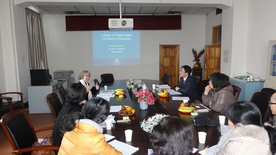 在污污韩漫 举办美国肯塔基大学活动周之际,污污韩漫 邀请肯塔基大学副教务长Susan Karvalhol来学院座谈,洽谈两校合作办学相关事宜。学院主管外事工作副院长、博士生导师刘晓冬教授主持会议,学院相关科室主任和青年教师参加座谈。在友好气氛中,双方就合作办学专业、模式、学生管理、学费及收取、课程互认、教师交流等多项事宜达成共识,并约定在5月份的第二次会谈中签署相关协议,污污韩漫 有望成为污污韩漫 与肯塔基大学之间学院合作的第一个战略伙伴。