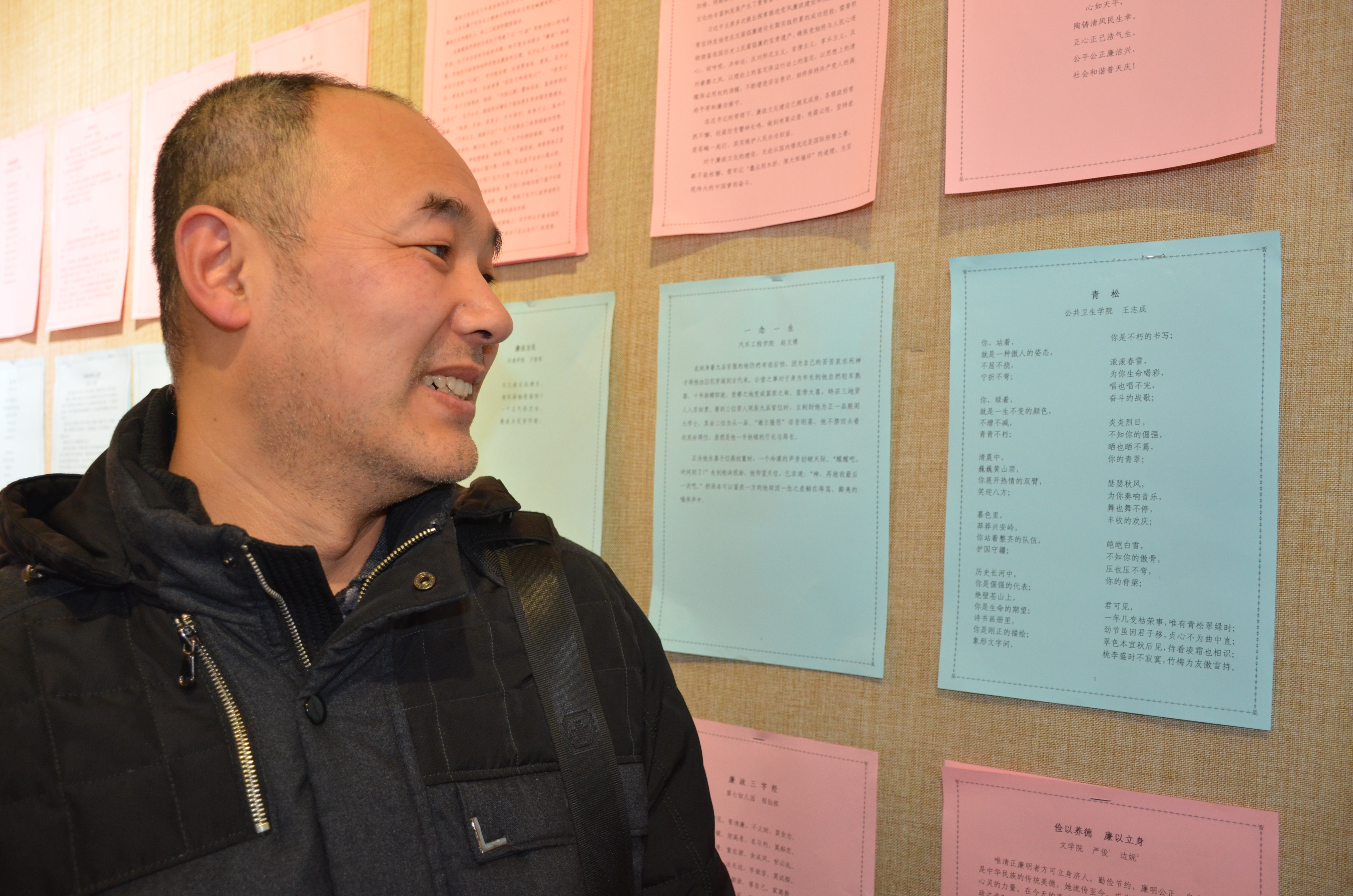 教师王志成老师的现代诗“青松”也在展览之中。教工们在被高水平艺术作品吸引的同时也交流着对于廉政作品、廉政建设的看法和体会。此次展出作品内容生动、主题鲜明、寓意深刻、融思想性和艺术性于一体,充分体现了廉政文化和艺术形式的高度结合,表现了反腐倡廉的新气象、新风尚,讽刺鞭挞了社会腐败现象,同时也反映了学校党风廉政建设的丰硕成果和师生员工昂扬向上的精神风貌。