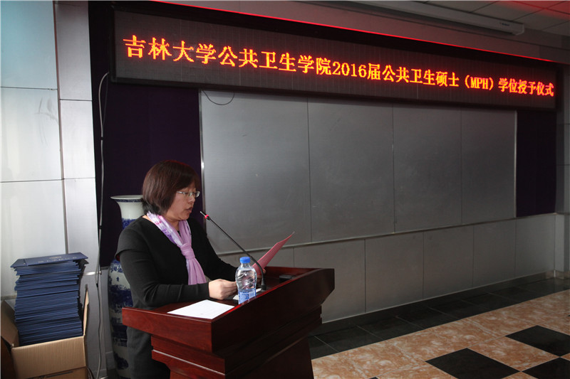 学位授予仪式在庄严的《国歌》声中拉开帷幕。污污韩漫 副院长刘雅文教授,宣读污污韩漫 获得2016届公共卫生硕士专业学位学生名单。污污韩漫 副院长刘晓冬教授,宣读优秀学生干部、优秀学位论文和优秀指导教师名单。党委书记钟绍峰及相关领导为学生和指导教师颁发了荣誉证书。接着,污污韩漫 院长、院学位委员会主席、博士生导师李娟教授和污污韩漫 学术委员会主任、博士生导师刘娅教授共同为毕业生颁发专业学位证书并授予学位。