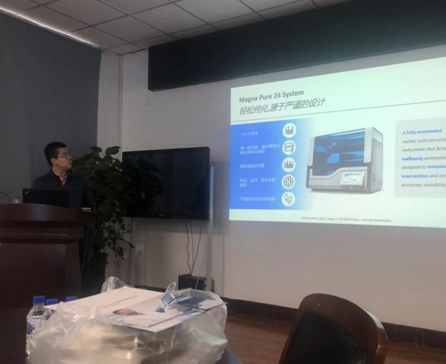 本次交流活动,来自罗氏诊断产品有限公司的罗山技术支持工程师进行了主题为《罗氏公司生命科学整体分子解决方案在科研中的应用》的技术讲座。参会人员针对荧光定量PCR仪和全自动核酸纯化仪等内容进行了交流和讨论。本次活动促进学院青年学者对于罗氏检测仪器相关技术的了解。
