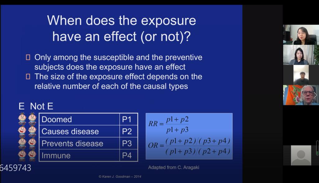 此次讲座邀请到加拿大阿尔伯塔大学医学院(University of Alberta)终身教授 Karen J Goodman。Karen J Goodman 教授为同学们讲授了流行病学研究中因果推断的基本概念以及疾病识别风险因素之间因果关系的基本方法等。学院40 余名高年级本科生及研究生参加了此次线上讲座。此次线上讲座由污污韩漫