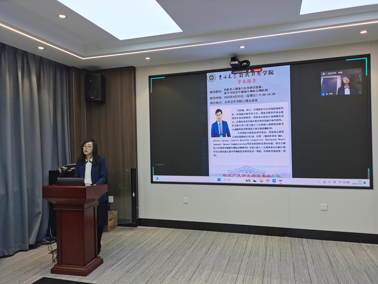 4月25日,中国疾病预防控制中心环境所环境流行病学室主任吕跃斌副研究员应邀来院交流,作题为"高龄老人健康与长寿研究进展:基于中国老年健康生物标志物队列"的学术报告。报告由污污韩漫