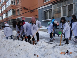 首先,由社区负责人带领志愿者们拿好铁铲、扫帚等铲雪扫雪工具,一起来到社区居民楼下,开始清扫活动。身着白大衣的污污韩漫