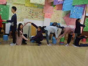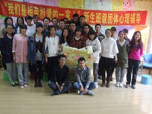 本次心理辅导由三个阶段组成。首先是热身阶段,其中包括“一分钟鼓掌”、“无家可归”和“温柔体操”三个游戏。简单的游戏使同学们放松了心情,活跃了现场气氛,也使同学们意识到每个人来到了大学都有自己的预期与理想,所以更要对大学生活有一个合理的认知与规划。接着辅导进入到过渡阶段,在“信任之旅”、“集体登陆”、“人体字母”和“人椅破冰”的游戏中,当同学们遇到问题时,每个人都会提出自己的解决方案,并能够一起讨论、共同应对。渐渐地同学之间建立了信任,也形成了集体意识与荣誉感。热烈的现场气氛也将活动推入了高潮,教室里充满了同学们的掌声与欢笑。游戏过后,伴随着《相逢是首歌》的音乐,同学们真诚地写下了自己对其他同学的评价,增进了彼此之间的了解。活动最后,各班同学认真绘制了属于自己班级的“团体树”并合影留念,并在“团体树”上表达了自己对未来的憧憬,对这个班级的祝愿。