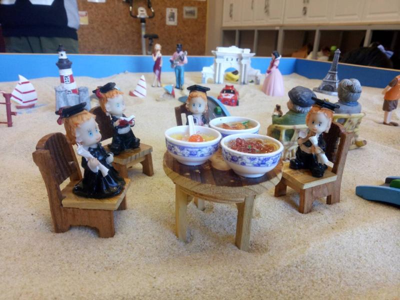 活动开始之前,汤晓老师对沙盘体验活动做了简要介绍,然后让同学们依次按照自己的想法进行沙盘的填充与摆放,经过几轮后原来空荡荡的沙盘,初步形成了“理想家园”的模样。同学们认真摆放并再三查看整体状态,以构建出内心设想的场景。紧接着,同学们完成了沙盘的填充与摆放,大家围绕共同创建的沙盘展开了讨论,依次讲述了自己最喜欢沙盘的哪个部分。与此同时,同学们还设想自己是沙盘中的某一部分或某一人物,表达出了自己在理想世界中的角色,使全身心得到放松。在交流与讨论中,展现出了同学们丰富多彩的心理活动和生活状态。最后,同学们和共同构建的沙盘进行拍照并集体合影留念。