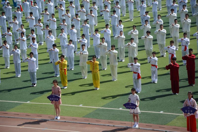 只听一声令下,同学们纷纷行抱拳礼。公卫学子们一袭白衣,系着红色的腰带,像军人一般昂首挺胸地站在操场上,成为了运动场上一道亮丽的风景线。伴随着雄壮的音乐响起,同学们整齐划一的动作如行云流水一般,展现在观众的眼前,一招一式尽显少年意气,一拳一腿满是青春芳华。炎炎烈日之下,滚烫的操场之上,他们毫不懈怠,只想将自己勤学苦练的成果做出最好的诠释。当收势的口令响起,同学们又迅速站好,像一棵棵笔直生长的大树。