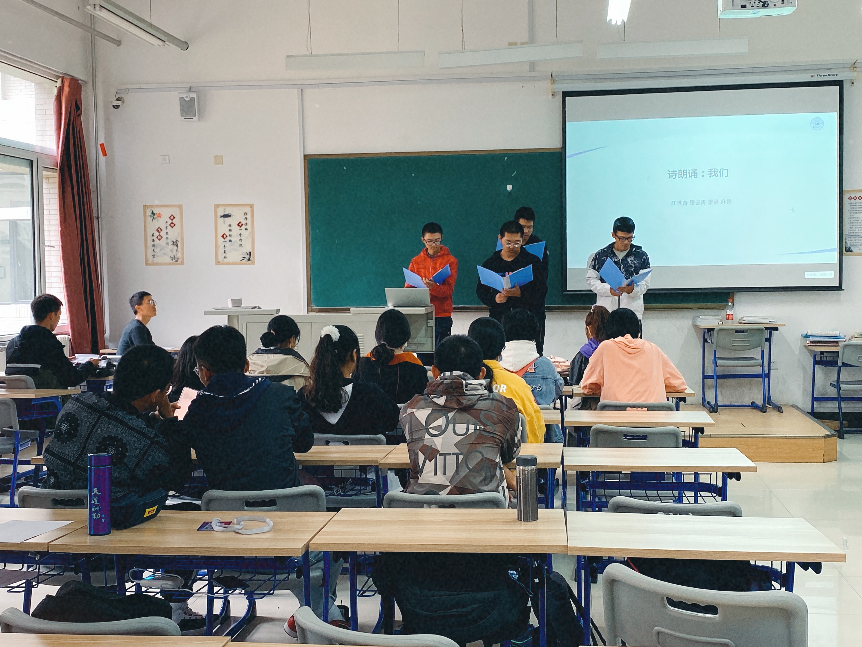 上午九时四十五分,班会在刘俊涛同学的主持中拉开序幕。首先由来自湖北孝感的闵玥同学讲述了在抗疫期间身边的动人故事。无数的逆行者们用自己的生命和疫情对抗,也正是由于这些最可爱的人,疫情才能够在如此短的时间内得到有效控制。随后,王羽丰同学和王懿晨等同学分享了河南省和新疆省的疫情防控措施和基层党员工作者的疫情工作,展现了我国疫情防控措施的良好落实情况,也展现了每一位中国人在面对危难时的责任与使命意识。此外,强珍等同学带来的诗朗诵和成小丹等同学的演讲则赞扬了挺身而出的逆行者们,展示了“战疫”中激情澎湃的青春力量,表达了我们无数中国人下定决心,攻克疫情的豪情壮志。同时也赞颂了那一袭袭白衣,那一幅幅铁骨汇聚成的传奇,令人感动深思,激励大家与疫情战斗,携手共抗疫情。活动的最后,《你要相信这不是最后一天》的合唱表达了对祖国美好的祝愿与希望,呼吁大家为祖国奉献出自己的一份力量。