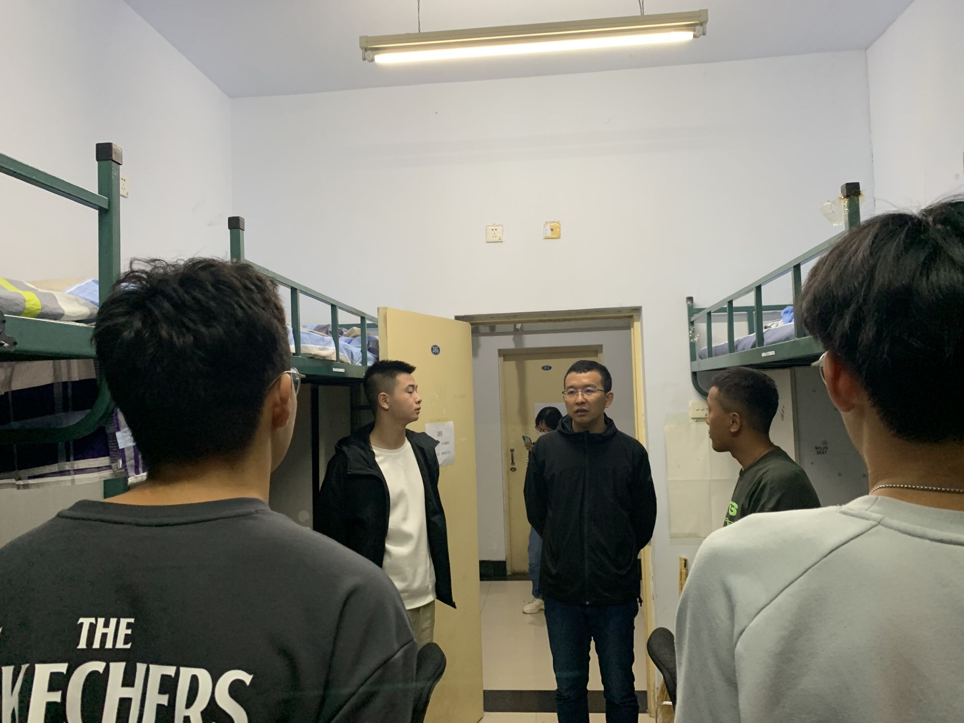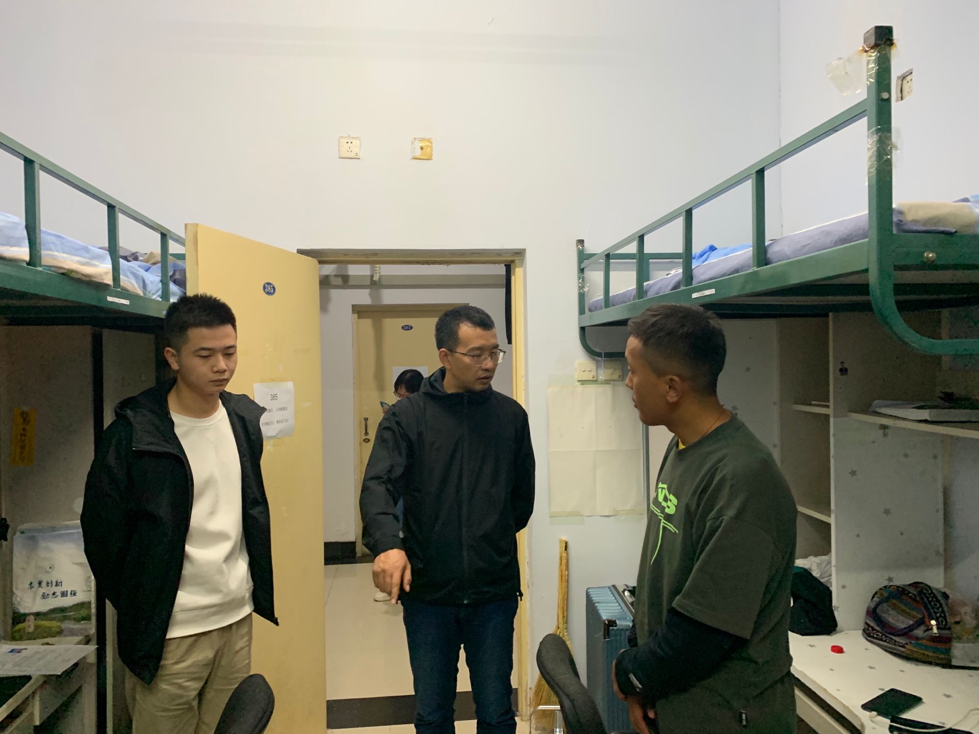 苏国范老师走进寝室,了解同学们的生活状况,并针对如何处理寝室关系,如何快速融入班集体,以及如何适应大学生活等提出了宝贵意见。同学们十分认真的听取了老师的建议。在此次查寝的过程中,苏国范老师与同学们进行了友好的交流,了解同学们的学习和生活,家乡在哪里,让本地同学尽地主之谊,帮助外地同学快速的融入宿舍生活,并提醒男同学不能天天打游戏,要平衡学习和生活。并且对于评选经济关注对象等事宜进行了讲解,鼓励家庭困难的同学了解并申请经济关注对象。