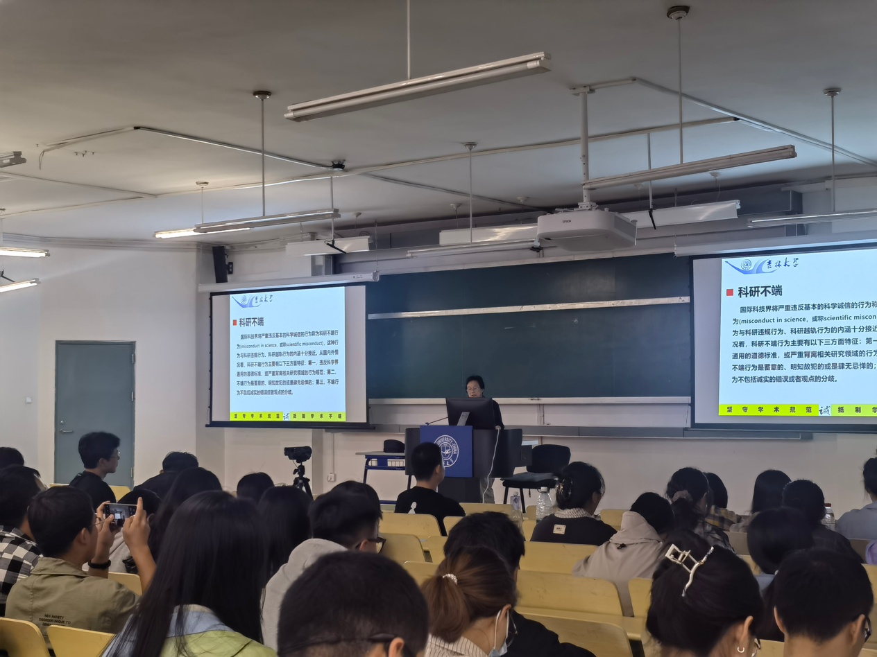 刘娅教授着重从学术规范、学术不端、科研规范、科研不端等方面为同学们进行了解读,并针对多种科研不端行为,如抄袭剽窃、一稿多投和重复发表等问题结合真实案例进行了详细的阐述。研究生是青年科技工作者的重要组成部分,是中国科技发展的未来。只有从迈入科研大厦的第一天就扎根科学道德大地、扎根学风优良土壤,牢牢恪守科学道德和优良学风的基本规范,学术人生才能沿着正确的方向发展,才能在攀登科学高峰的征程中不断前进。